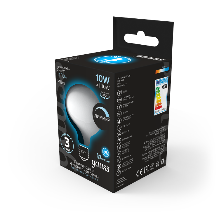 Лампа Gauss Filament G125 10W 1100lm 4100К Е27 milky диммируемая LED 1/20