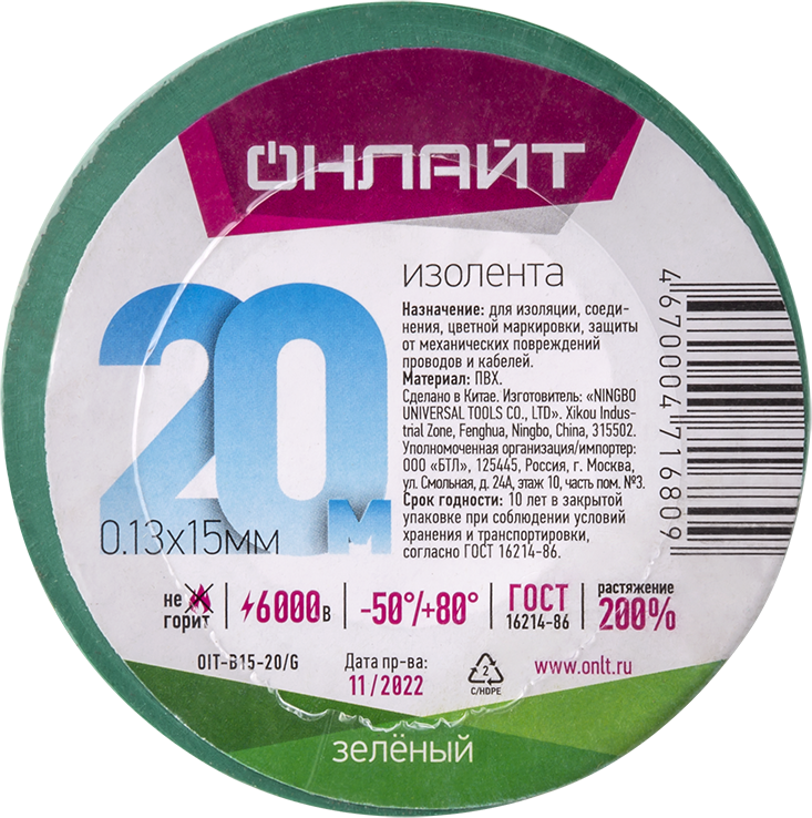 Изолента ОНЛАЙТ 71 680 OIT-B15-20/G ПВХ зеленая (Китай)(кр.1шт)
