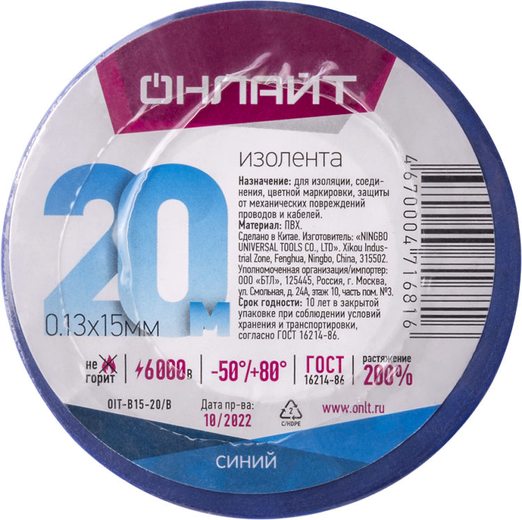Изолента ОНЛАЙТ 71 681 OIT-B15-20/B ПВХ синяя (Китай)(кр.1шт)