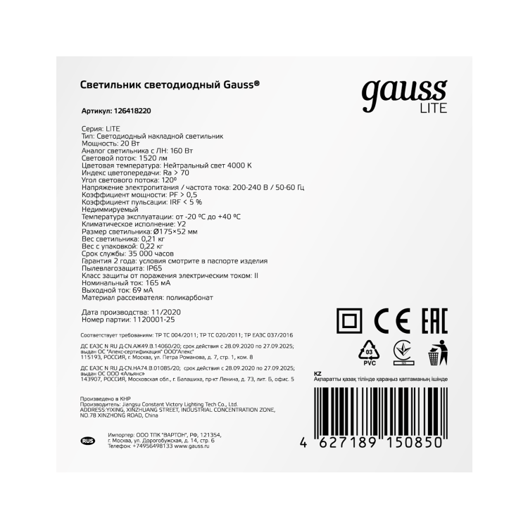 Светильник ЖКХ Gauss LITE круг 20W 1520lm 4000K 200-240V IP65 D175*52мм белый LED 1/40