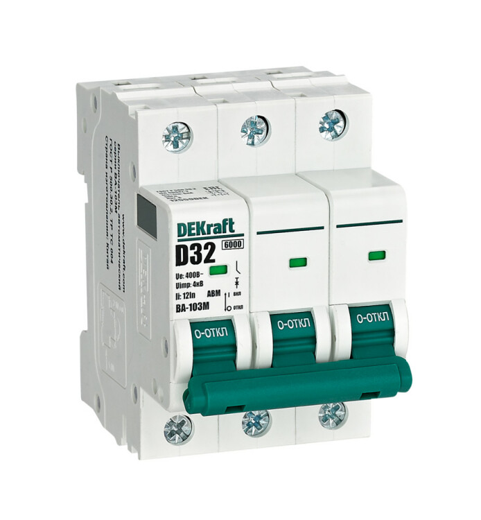 Автоматический выключатель без теплозащиты серии ВА-103M DEKraft; 3P; ном. ток 32 А; ном. раб. напряжение 400 В; кривая отключения D. Автоматические выключатели серии ВА-103М имеют специальное назначение для систем противопожарной защиты и вентиляции и выдерживают ток КЗ до 6000 А. Также они могут использоваться для нечастых оперативных включений и отключений указанных цепей. Автоматические в ыключатели соответствуют директиве RoHS, имеют расширенный диапазон рабочих температур от -25 до +60 °C, удобны и безопасны в эксплуатации.