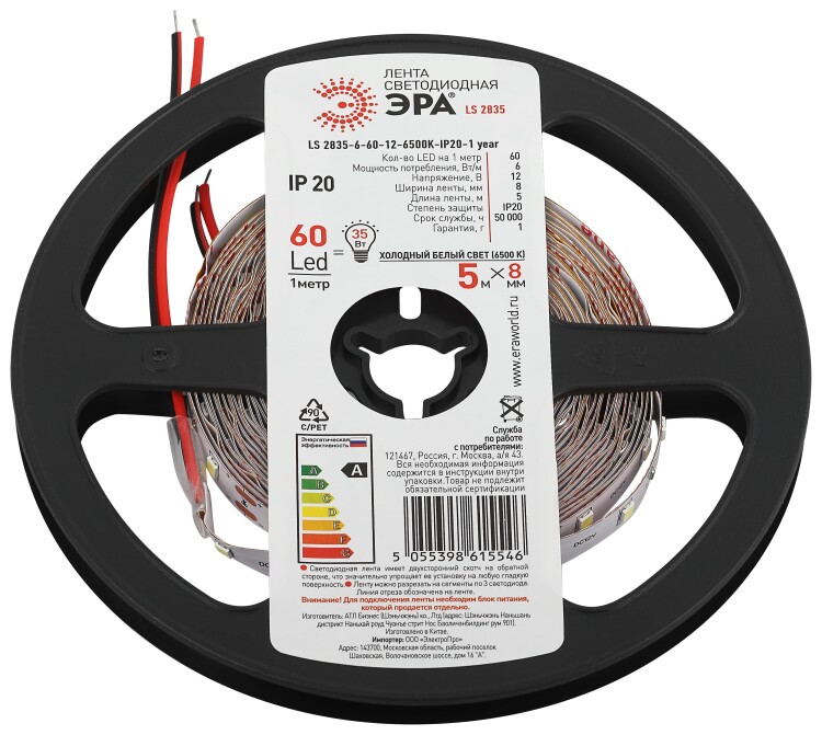 Светодиодная лента ЭРА LS2835 6-60-12-6500K-IP20-1 year-5m холодный белый свет со степенью защиты от пыли и влаги IP20 - современный способ создания внутреннего освещения, подсветки ниш, лестничного пространства, систем хранения, а также декоративного и художественного оформления любых объектов и форм в помещениях. Легко и быстро устанавливается на любой гладкой поверхности с помощью скотча, расположенного на оборотной стороне ленты. Используя алюминиевый профиль, можно создавать необычные и функциональные решения освещения в Вашем интерьере. Рабочее напряжение ленты составляет 12В, а мощность равна 6Вт/м. Светодиодная лента обладает световым потоком 400 Лм/м, и цветом свечения - холодный белый (6500 K)