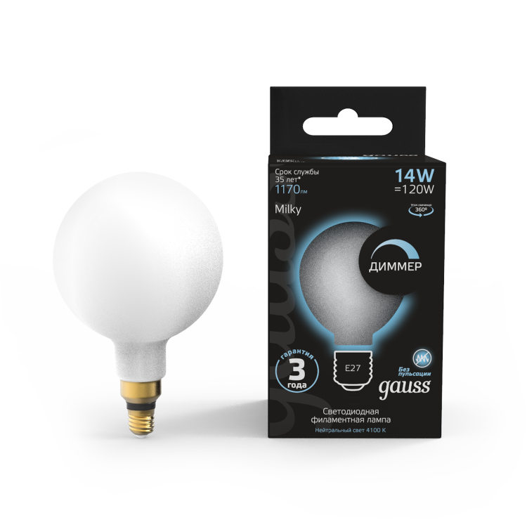 Лампа Gauss Filament G200 14W 1170lm 4100К Е27 milky диммируемая LED 1/4