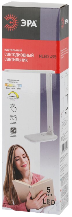 Настольный светильник ЭРА NLED-495-5W-W со светодиодами (LED) в качестве источников света в дизайне "под кожу". Встроенный литиевый аккумулятор для автономной работы. Подзарядка от USB. USB-кабель в комплекте. Оснащен сенсорным управлением с возможностью выбора цветовой температуры (теплый, нейтральный или холодный свет). Плавный диммер для регулировки яркости. Выключатель для отключения/блокировки сенсора. Направление света регулируется наклоном стойки и поворотом панели со светодиодами относительно стойки для максимального комфорта. Складная конструкция для оптимального хранения.