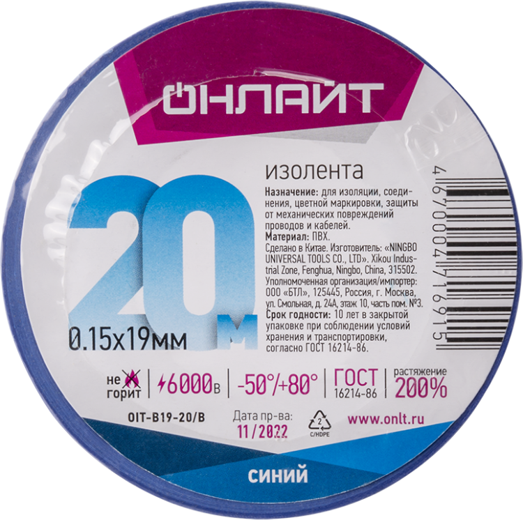Изолента ОНЛАЙТ 71 691 OIT-B19-20/B ПВХ синяя (Китай)(кр.1шт)