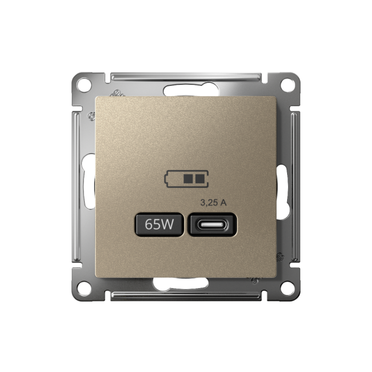 Розетка Systeme Electric (ранее Schneider Electric) серии AtlasDesign в цвете шампань USB с разъемом типа C высокоскоростная. Самая современная USB-зарядка позволяет заряжать ноутбук, а также смартфоны последнего поколения, которые поддерживают функцию быстрой зарядки. Мощность: тип-С - 65Вт. Поддерживает современные протоколы быстрой зарядки QC, PD, последних версий. Лицевые детали из качественного ABS-пластика, устойчивого к царапинам и УФ-излучению.