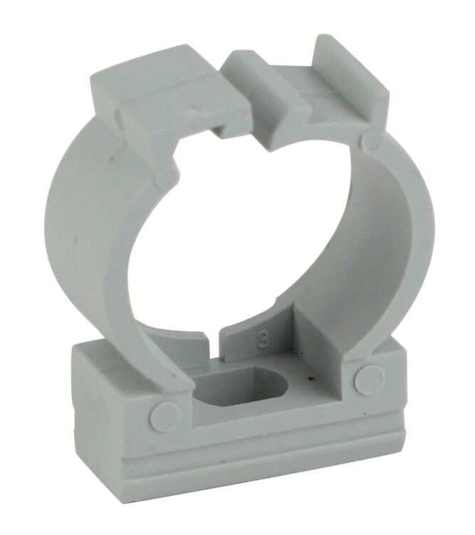 Используется для крепления гофрированных и гладких труб к поверхности стен или потолка. Для крепления к поверхности в крепёж-клипсе предусмотрено технологическое отверстие под саморез или дюбель.