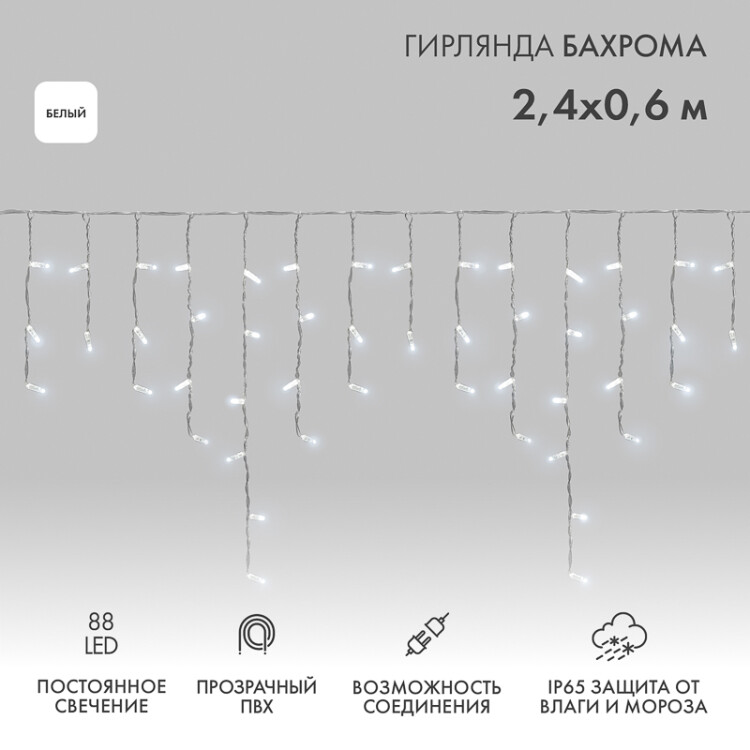 Гирлянда Айсикл (Баxрома) представляет собой гибкий горизонтальный шнур-шину, к которому через определенные промежутки крепятся вертикальные нити разной длины со светодиодами. Гирлянда имитирует сосульки и может послужить оригинальным решением при украшении карнизов, арок, фасадов зданий, витрин магазинов, а также стать эффектным элементом декора внутри помещений.Благодаря использованию светодиодов отличительной особенностью гирлянды является превосxодная яркость и низкое энергопотребление.При длине 2,4 м гибкая направляющая имеет 24 вертикальные нити от 20 до 60 см. Гирлянда имеет белый цвет свечения и предназначена для использования как внутри помещений, так и снаружи.