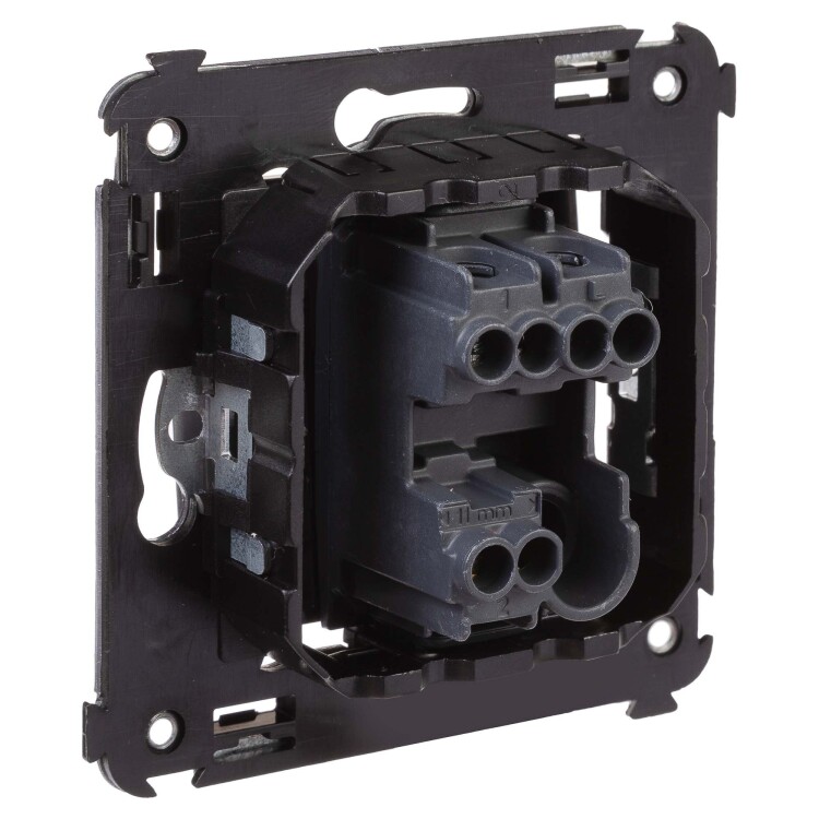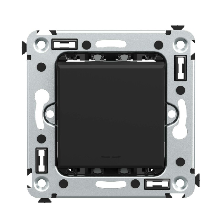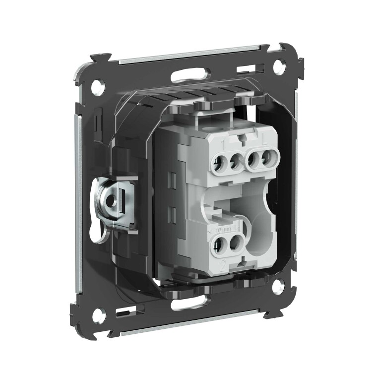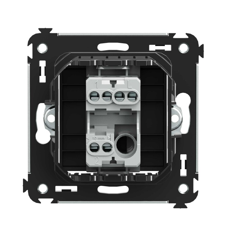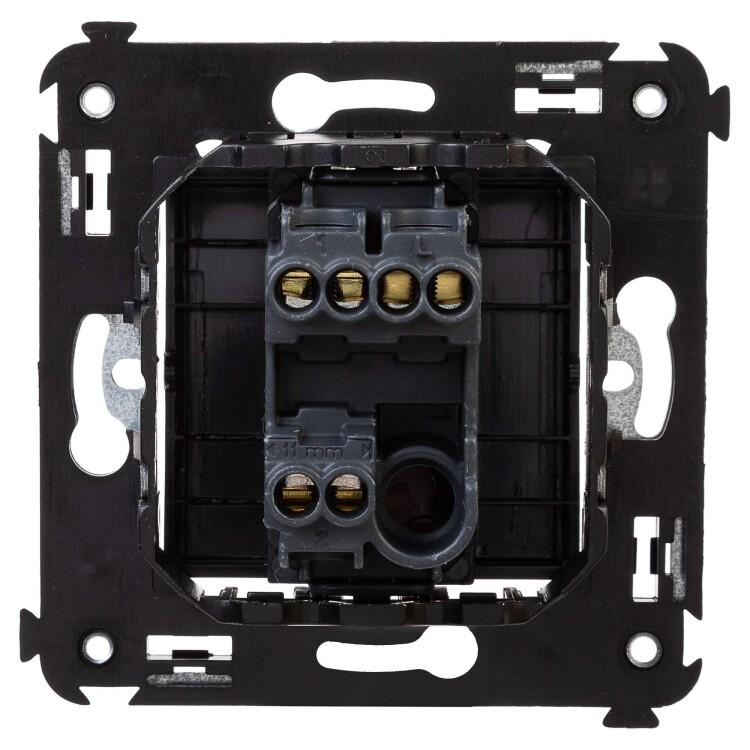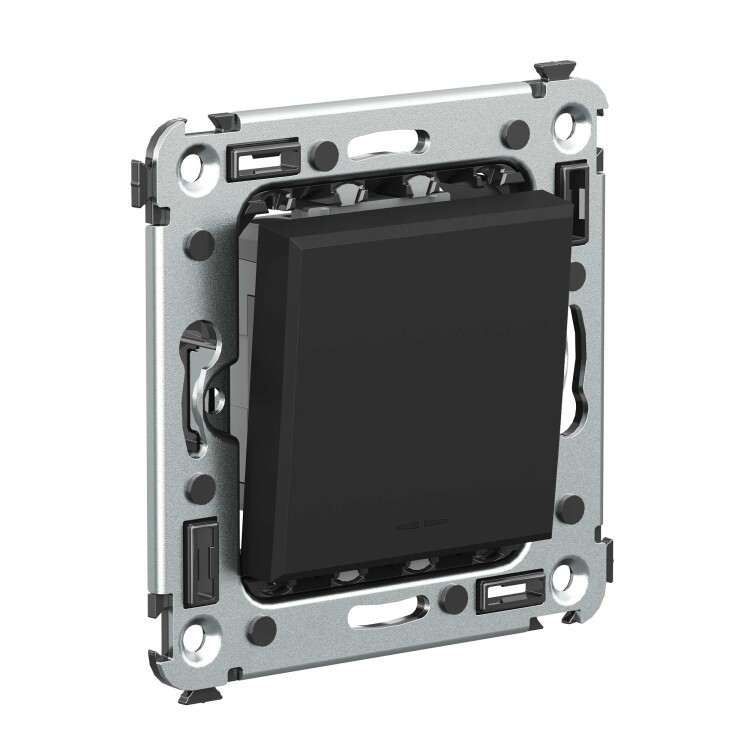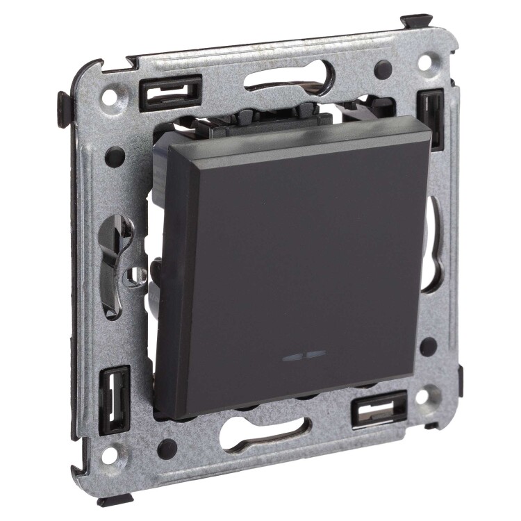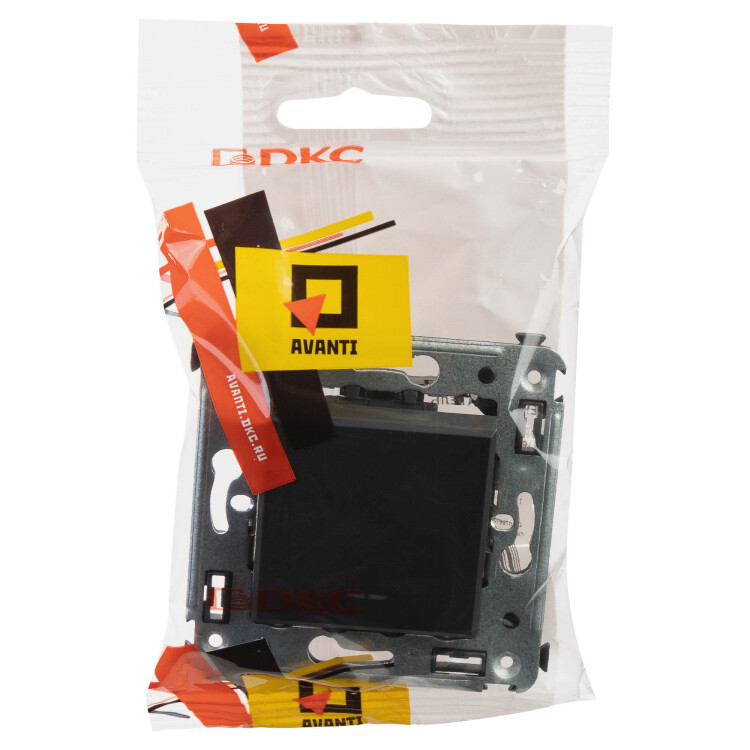 Переключатель одноклавишный в стену серии "Avanti". Предназначен для монтажа в подрозеточные коробки (код 59301). Используется для включения/выключения освещения из двух мест. Диаметр отверстий для ввода кабелей – 3 мм (по 2 отверстия на одну клемму); винтовые зажимы; шаблон для зачистки кабеля – 11 мм. Номинальный ток – 16 A. Номинальное напряжение – 230 В. Фиксация производится в подрозеточную коробку при помощи саморезов. 2 модуля. Цвет: "Черный матовый".