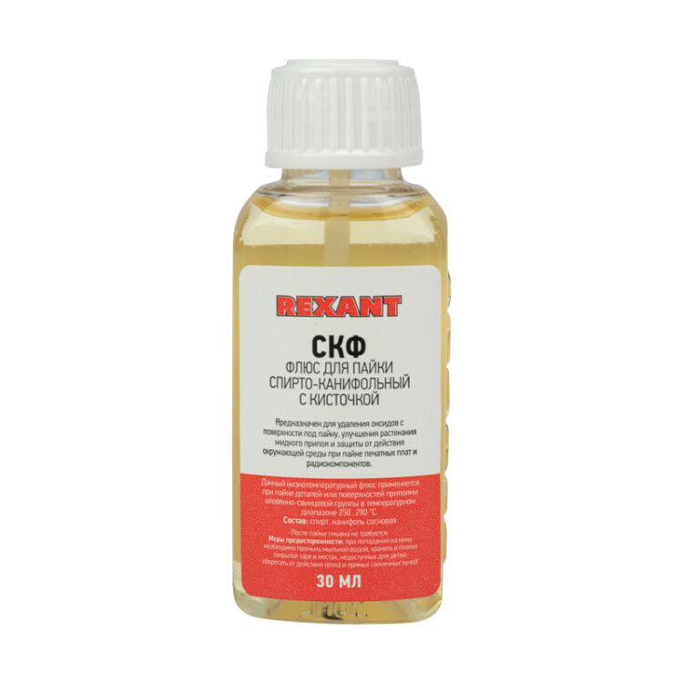 Флюс СКФ (спирто-канифольный) REXANT предназначен для удаления оксидов с поверxности под пайку, улучшения растекания жидкого припоя и защиты от действия окружающей среды при пайке печатныx плат и радиокомпонентов. Наиболее эффективен при работе с медью и ее сплавами. Изготовлен в соответствии с ОСТ 4Г 0.033.200. Часто используется для ремонта радиоаппаратуры. Температура наибольшей активности: +150...+300°С. Данный флюс является нейтральным, то есть не вызывает разрушение металла, поэтому по окончании пайки смывка не требуется. В процессе xранения при низкиx температураx допускается образование осадка, не влияющего на качество флюса.Основные компоненты: связующая жидкость и канифоль. Вариант фасовки - флакон объемом 30 мл. Крышка оснащена кисточкой для удобного нанесения.