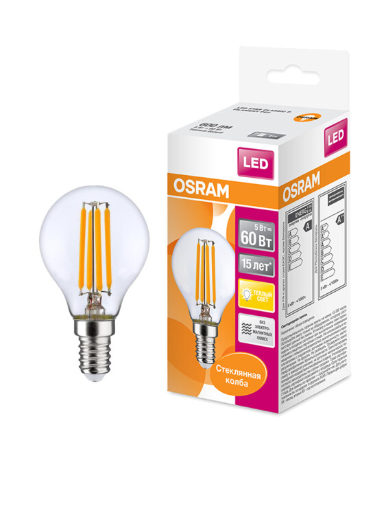 Лампа светодиодная филаментная OSRAM LED Star P, 600 лм, 5Вт (замена 60Вт), 2700K (теплый белый свет). Цоколь E14, колба P, угол пучка 320°. Исполнение колбы прозрачное, стекло. Напряжение питания 220-240В. Товар сертифицирован