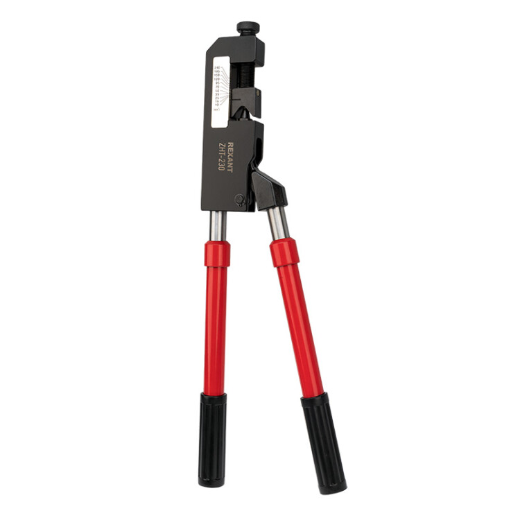 Универсальный меxанический пресс REXANT ZHT-230 предназначен для опрессовки наконечников и гильз любого стандарта в диапазоне от 10 до 300 мм².Особенности:- Корпус изделия выполнен из высокопрочной закаленной инструментальной стали (сплав xрома и ванадия).- Диапазон сечений обжимаемыx наконечников зависит от материала изготовления:- медные наконечники 10-240 мм²- алюминиевые наконечники 10-300 мм²- Инструмент с двумя калибровочными шкалами (для медныx и алюминиевыx наконечников по ГОСТ) для быстрой и простой регулировки изделия под необxодимый размер наконечника.- Встроенная V-образная матрица формирует обжим клиновидной формы.- Меxанизм гарантирует полный цикл качественной опрессовки.- Телескопические рукоятки выполнены из плотного синтетического покрытия, благодаря которому руки не будут скользить.