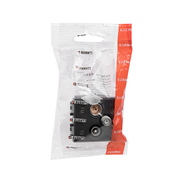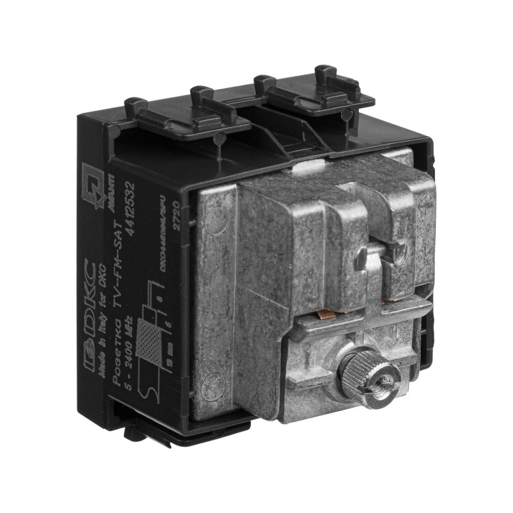 Розетк а TV-FM-SAT модульная. Назначение: для монтажа в систему пластиковых кабельных коробов «In-liner Front» и систему организации рабочих мест «Сотто» (Sotto) (в т. ч. кабель-каналы и короба «Aero») при помощи рамок-суппортов и каркасов «Avanti» (код 4400912 и т. д.). Используется для подключения теле- и радиокабеля. Характеристики: винтовые зажимы; диапазон рабочих частот 4–2400 МГц; затухание