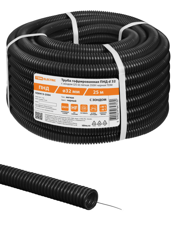 Труба гофрированная ПНД d 32 с зондом (25 м) легкая черная TDM (кр.25м)