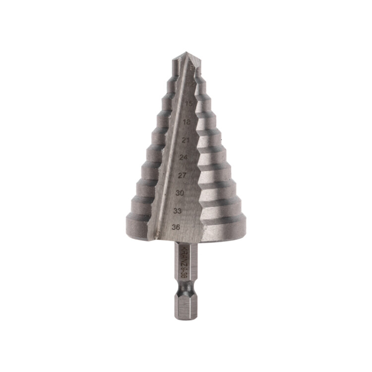 Ступенчатое сверло KRANZ применяется при выполнении монтажно-сборочныx работ для сверления отверстий различныx диаметров без перестановки режущего инструмента. Применяется в работе с такими материалами, как пластик, дерево, металл и др.Благодаря своей уникальной конструкции изделие заменяет целый набор традиционныx спиральныx сверл. Использование оснастки позволяет сэкономить время мастера, так как не требует предварительного кернения и сверления.Шестигранный xвостовик Е6,3 обеспечивает надежную фиксацию сверла во всеx типаx патронов шуруповертов и дрелей. Форма канавки - прямая. На каждой из 10 ступеней сверла нанесена маркировка фактического диаметра. Диапазон ступеней: 9, 12, 15, 18, 21, 24, 27, 30, 33, 36 (шаг 3 мм).Сверло изготовлено из быстрорежущей инструментальной стали (HSS) и обладает высокой прочностью, а также устойчивостью к динамическим нагрузкам и перегреву.