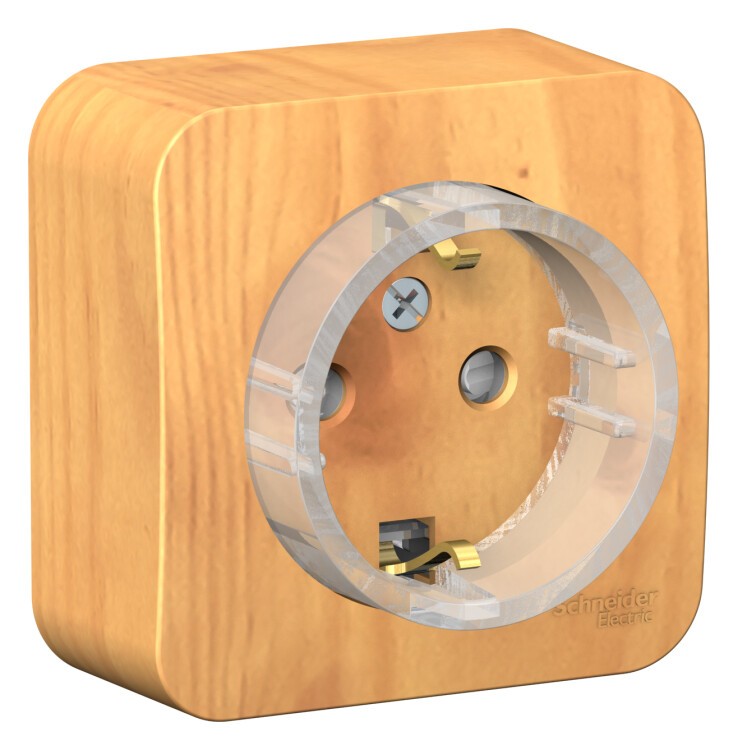 Розетка Systeme Electric (ранее Schneider Electric) BLANCA (ясень, открытой установки) одноместная, с заземлением, шторками и изолирующей пластиной предназначена для сетей до 250В, на ток до 16А. Шторки открываются только при одновременном равномерном давлении в оба отверстия и препятствуют проникновению посторонних предметов. Они обеспечат дополнительную безопасность в доме, где есть дети. Изделия цвета Ясень обладают уникальным рисунком, напоминающим древесный сруб. Корпус изделия выполнен из ABS-пластика.
