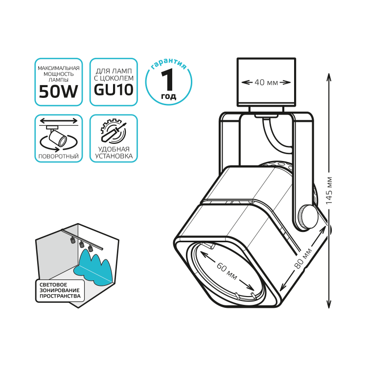 Светильник трековый Gauss куб GU10 TR009 изготовлен из стали и покрыт черной эмалью. Параметры у него соответствуют стандартам для сухих жилых помещений: IP20; угол светового пучка 41-80°; цоколь GU10, мощность устанавливаемой лампы до 50w. Благодаря тому что он настраивается в вертикальных и горизонтальных плоскостях и совместим с трековой системой Gauss, его можно применять во всех вариантах комплексной подсветки и в единичных световых акцентах.
