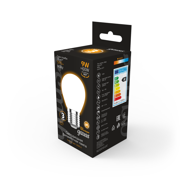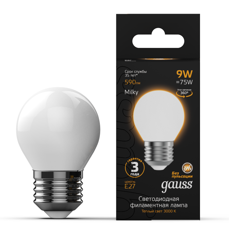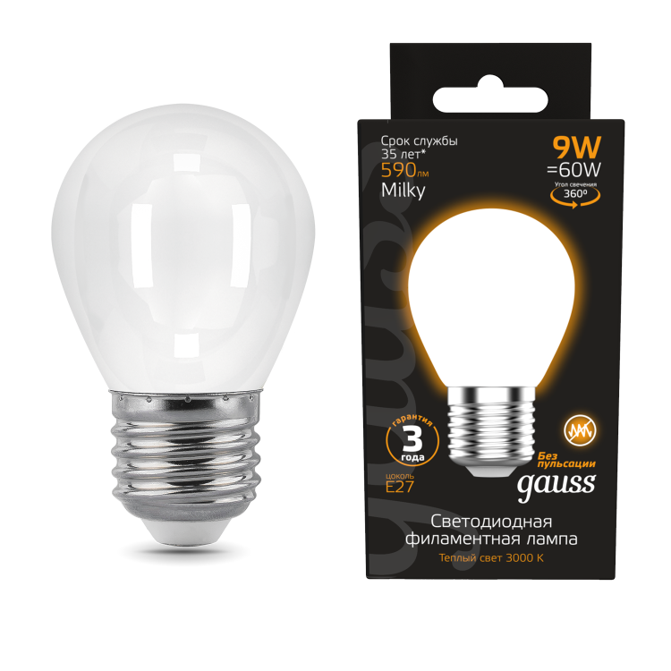 Лампа Gauss Filament Шар 9W 590lm 3000К Е27 milky LED 1/10/50