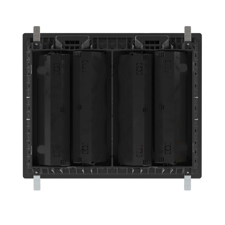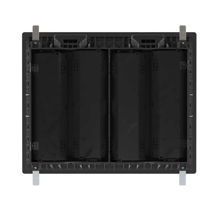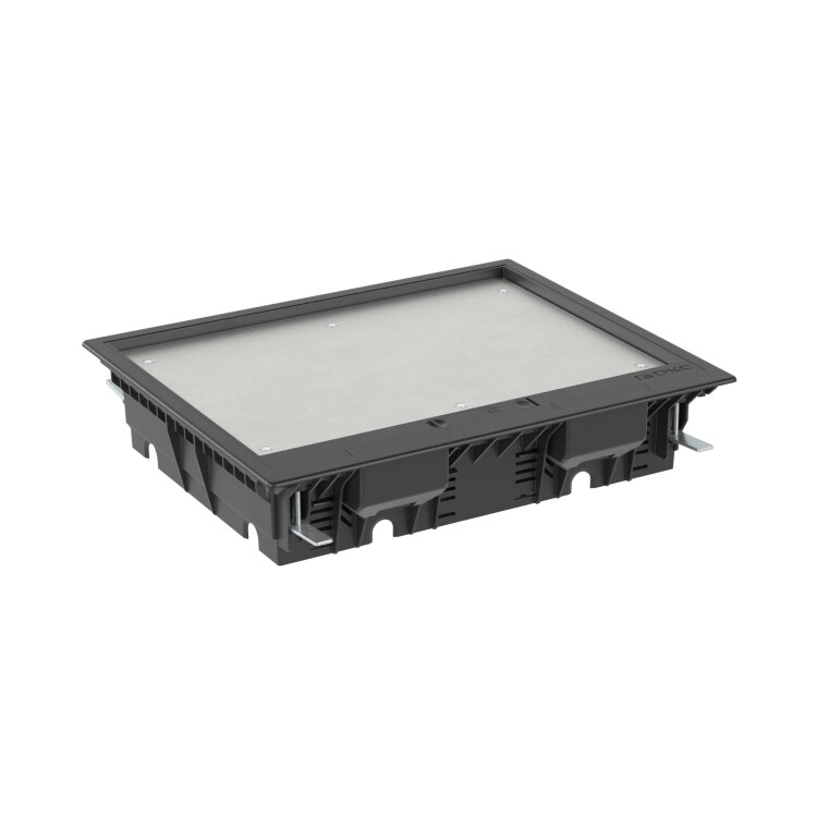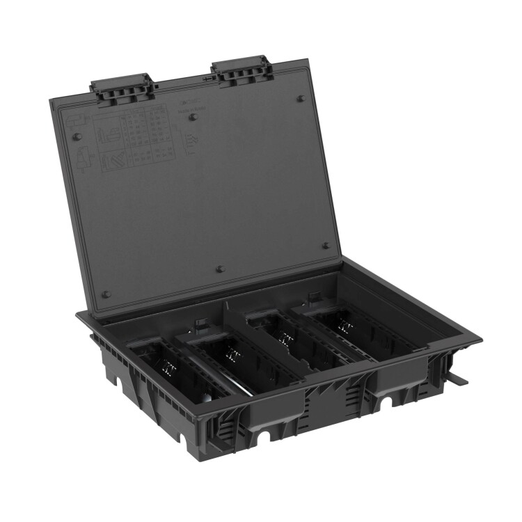 Назначение: организация рабочих мест в помещениях с открытым пространством. Устанавливается в фальшпол (толщина плит 20-45 мм), отверстие для монтажа 335×270 мм. Глубина монтажа от 73 до 108 мм. Крышка открывается под углом 110 градусов, предусмотрен монтаж напольного покрытия толщиной до 7,5 мм. Крышка усилена стальным листом, нагрузка: на малую площадь − 2000Н, на большую площадь — 2000Н (ГОСТ 61084-2-2-2022), допустимая нагрузка на крышку 450 кг (ГОСТ 61084-2-2-2007). Ручка с запорным механизмом. Монтаж ЭУИ ЭУИ «Вива» (Viva), «Avanti». Монтаж в четыре подрозеточных блока на 6 модулей каждый. Каркасы и рамки для ЭУИ заказываются дополнительно. Комплект поставки: лючок 24 модуля; основание и дно подрозеточного блока 6 модулей — 4 компл.; винт M4×35 — 4 шт.; крепёжный эл. 4 шт. — 1 уп. Цвет — чёрный.