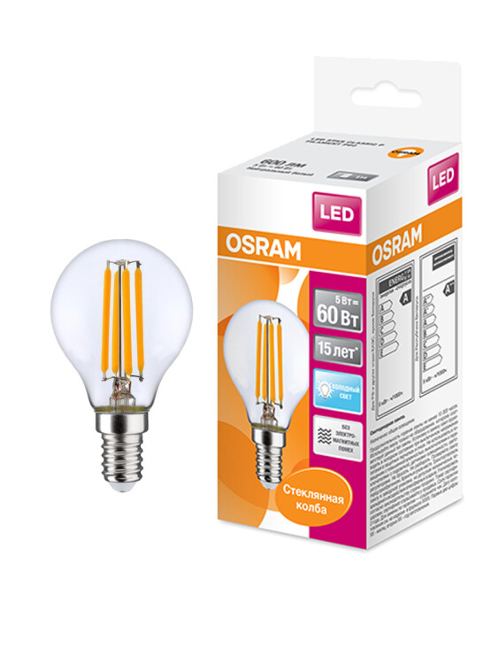 Лампа светодиодная филаментная OSRAM LED Star P, 600 лм, 5Вт (замена 60Вт), 4000K (нейтральный белый свет). Цоколь E14, колба P, угол пучка 320°. Исполнение колбы прозрачное, стекло. Напряжение питания 220-240В. Товар сертифицирован