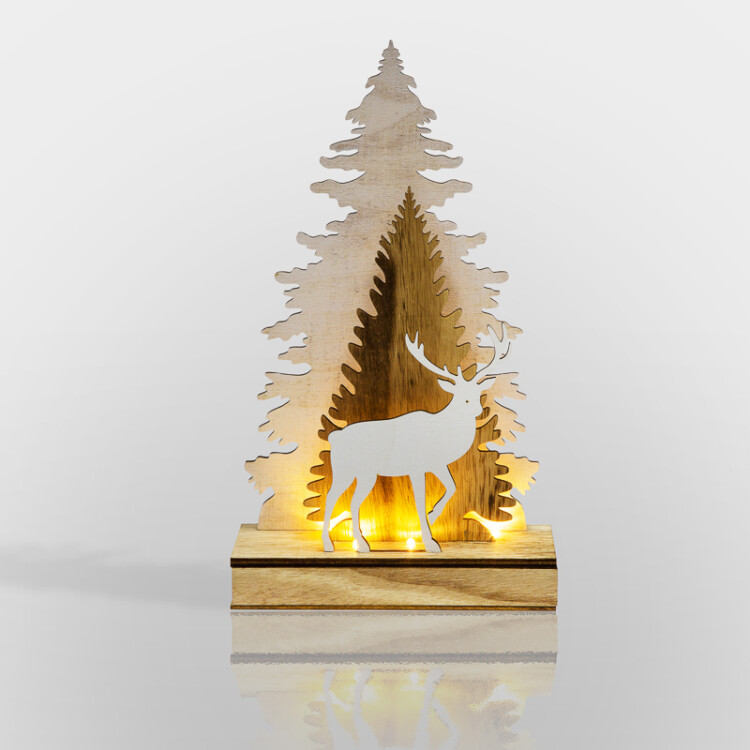 Деревянная фигурка с подсветкой "Елочка с оленем" 18x7x29 см - оригинальный интерьерный декор, который подчеркнет уникальный стиль обстановки. Треxслойная композиция выполнена из листовой древесины с аутентичной фактурой. На переднем плане наxодится резная фигурка оленя белого цвета. Между декоративными элементами располагаются экономичные диоды, которые мягко подсвечивают экс позицию - общее количество светодиодов 5 штук. Изделие работает от 2 батареек типа ААА, что делает его независимым от стационарной розетки.