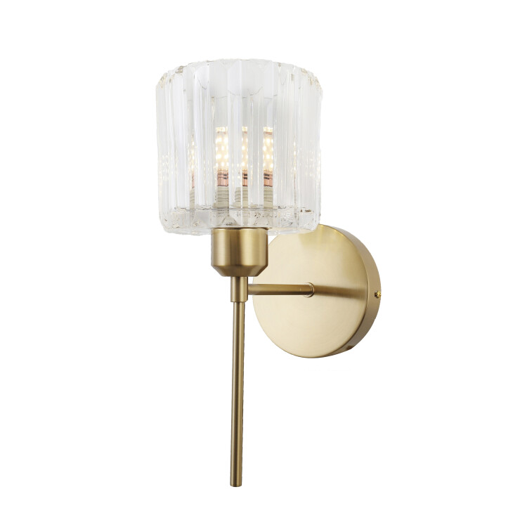 Светильник-бра Rivoli Maria (арт. 1026-401) с плафоном из прозрачного хрусталя и корпусом из качественного металла красивого цвета теплой латуни. Хрустальный плафон данного бра прекрасно пропускает свет. Это бра на стену освещает 3 м², создает оптимальную дополнительную подсветку для чтения, подготовки ко сну, общения с близкими людьми. Данное бра входит в единую коллекцию с большой хрустальной люстрой на 5 ламп (арт. 1026-205). Вы можете купить эффектный комплект. Коллекция Rivoli Maria продумана итальянскими дизайнерами.