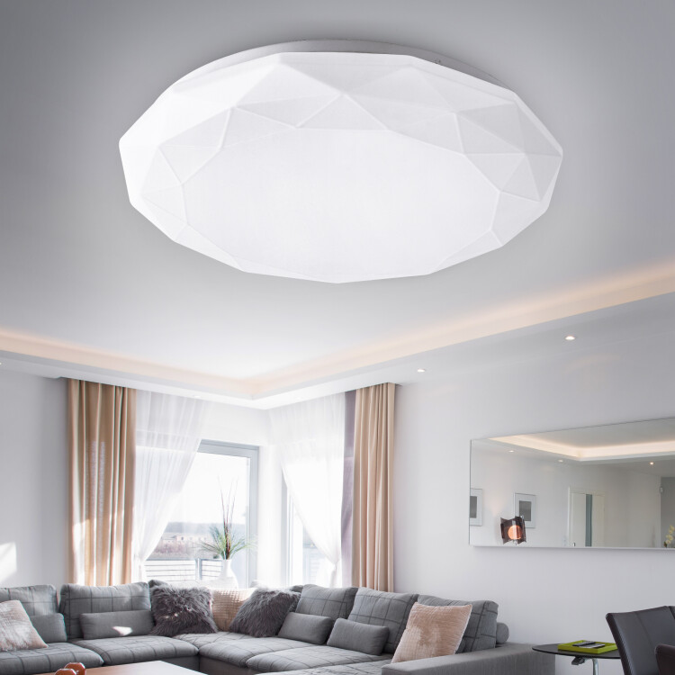 Особого внимания заслуживает дизайн плафона из пластика: рельефный орнамент, напоминающий калейдоскоп, идеально сочетается с плоской круглой формой. Такая потолочная люстра в стиле модерн облагородит интерьер гостиной, спальни или коридора.