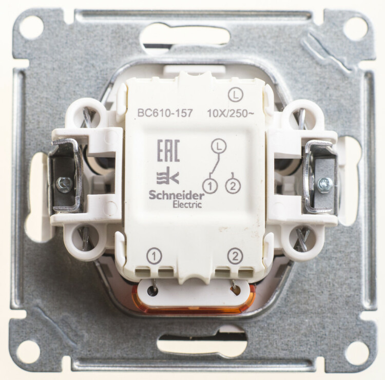 Механизм Systeme Electric (ранее Schneider Electric) W59 (цвет чёрный бархат) переключателя 1-клавишного с подсветкой подходит для сетей 250 В, на ток до 10 А.
