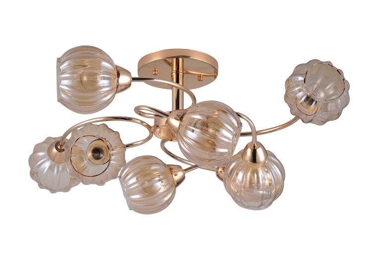 Коллекция люстр на потолок Amalia от итальянских дизайнеров бренда Rivoli состоит из моделей с разным количеством плафонов 4, 6 и 8. Артикулы для поиска: 3090-304, 3090-306, 3090-308. Это оригинальные люстры в золотом цвете. Их отличают лаконичная современная арматура и стеклянные тонированные плафоны с геометричным рифлением.