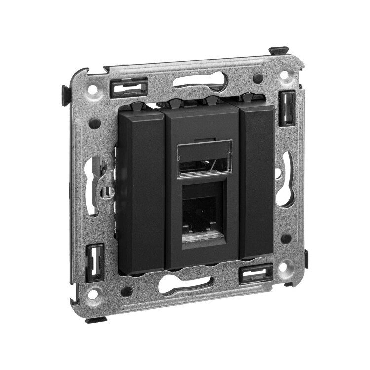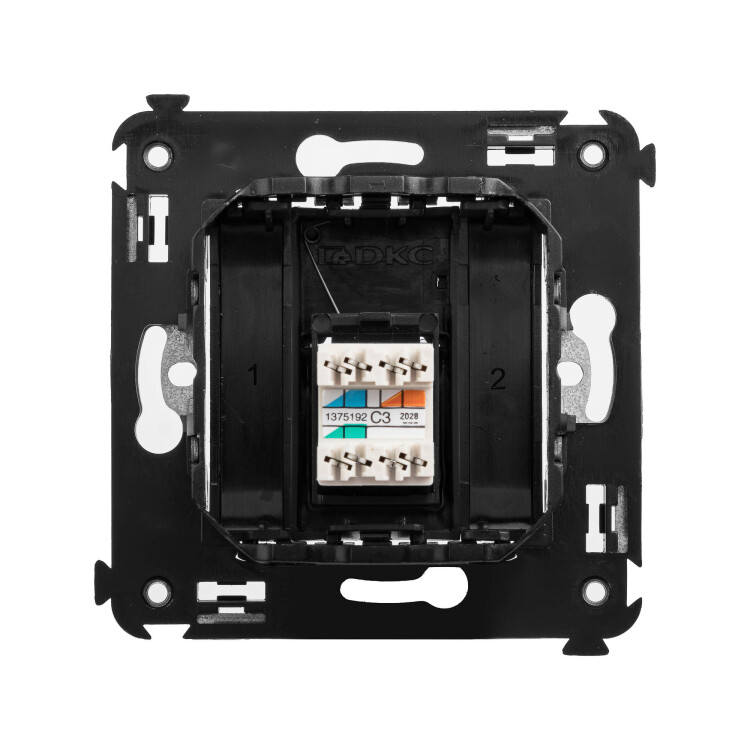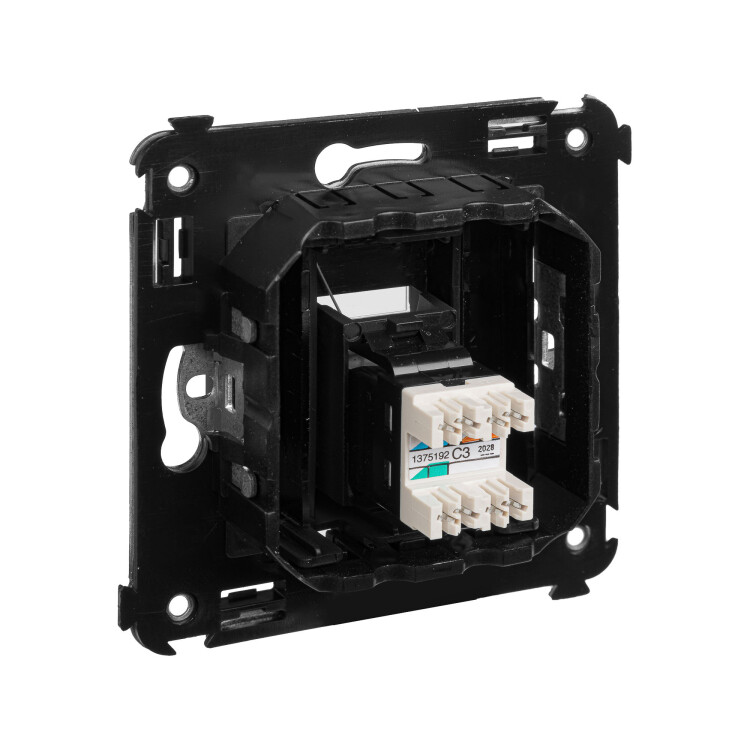 Телефо нная розетка одинарная RJ-12 для монтажа в стену. Предназначена для монтажа в подрозеточные коробки глубиной не менее 45 мм (код 59301). Используется для подключения телефонного кабеля к рабочему месту. 6P6C. С пылезащитной шторкой, маркировочной табличкой. В комплекте разъем Keystone. Для заделки контактов используется инструмент типа 110. 2 модуля. Цвет: "Черный матовый".