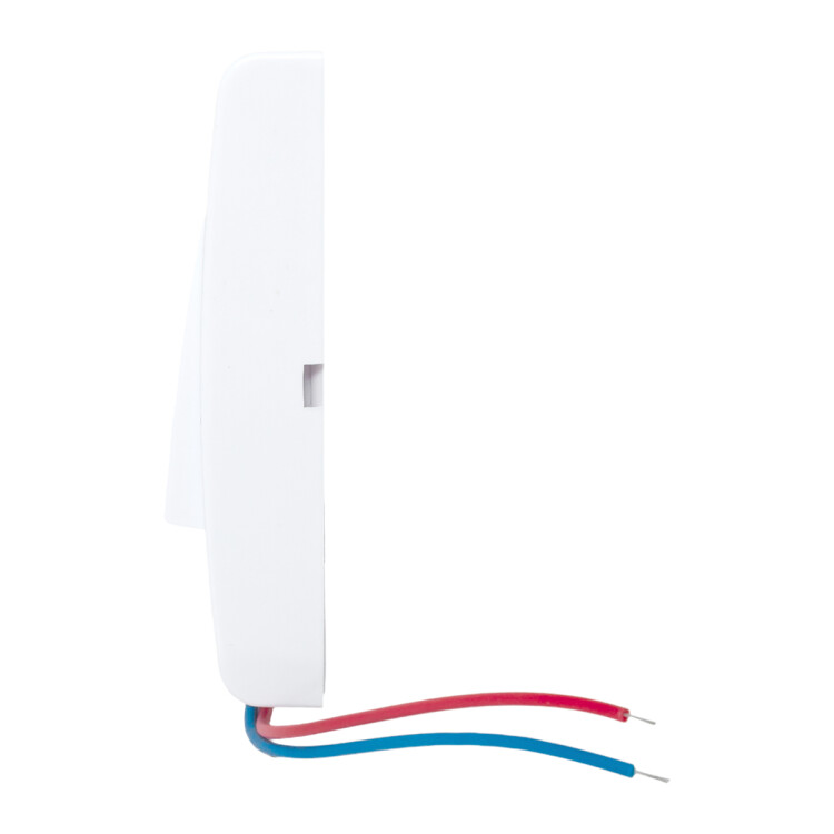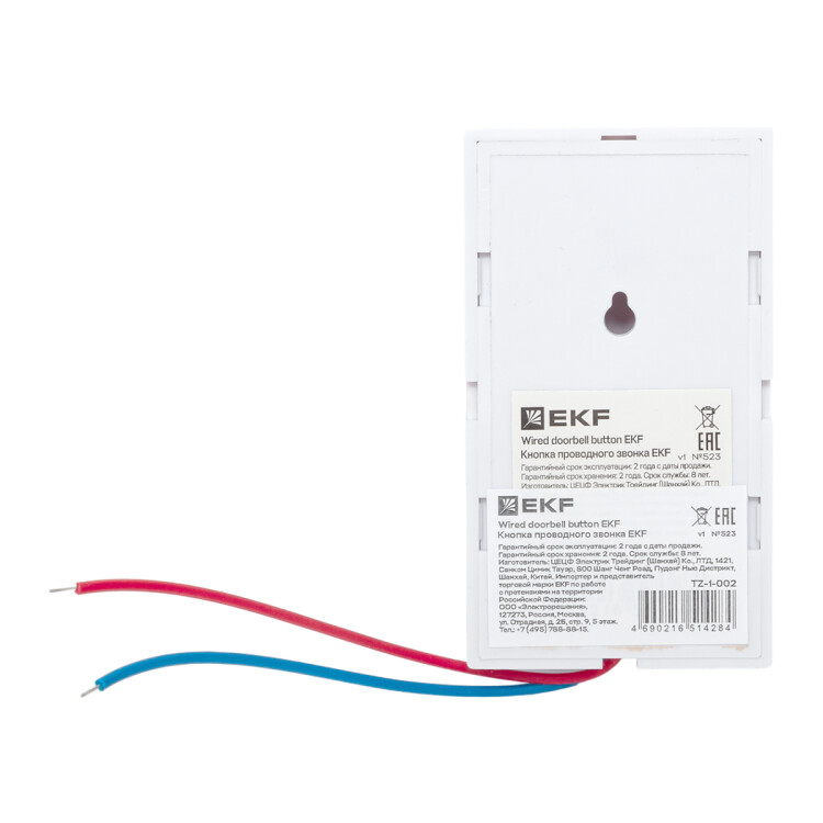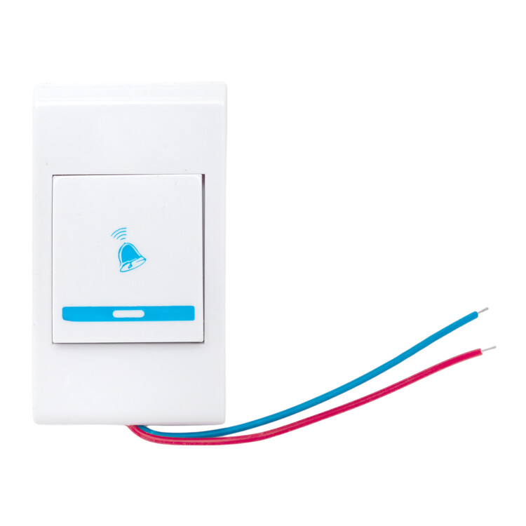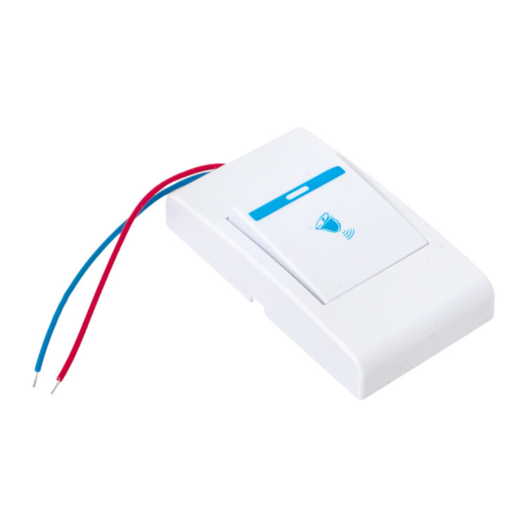 Кнопка предназначена для накладного монтажа. Изготовлена из прочного белого пластика с гладкой поверхностью. Дизайн кнопки простой и минималистичный, что позволяет ей гармонично вписываться в различные стили фасадов и дверей. Кнопка выступает над основанием, что обеспечивает легкость нажатия. Основание кнопки крепится к стене или дверной раме, и включает в себя необходимые провода для подключения к внутренней системе звонка. В дизайне преобладают чистые линии и минимализм, делая её универсальным выбором для многих домов.