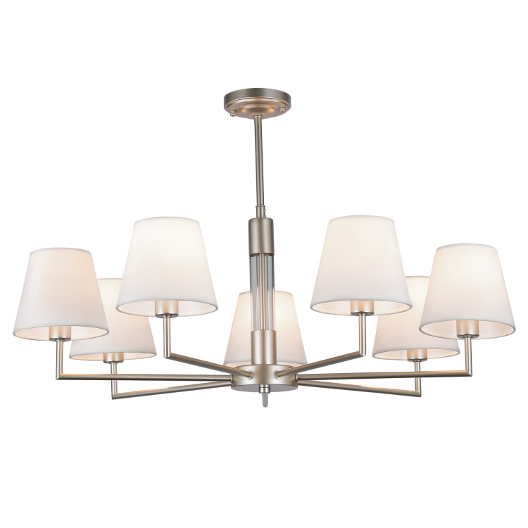 Люстра потолочная классическая с качественным ровным светом, количество плафонов – 7, освещаемая площадь – до 21 м2. Rivoli Freda – коллекция в классическом стиле, в которую входят люстры под 5 и 7 ламп (арт. 2089-305 и 2089-307), настенное бра под 1 лампу (арт. 2089-401). Металлические рожки коллекции имеют чёткие линии, плафоны-абажуры обтянуты тканью матового белого цвета. Цвет арматуры – серебристый. Стойкое гальваническое покрытие сохраняет красоту оттенка на долгие годы.