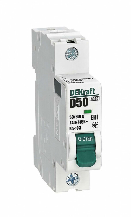 Автоматический выключатель серии ВА-103 NEW DEKraft; 1P; номинальный ток 50 А; характеристика D; отключающая способность 6 кА, что позволяет использовать аппараты в качестве вводных. 5 монолитных заклепок повышают прочность корпуса аппарата. Окошко-индикатор всегда показывает состояние контактов вне зависимости от положения рукоятки управления. Боковые каналы охлаждения повышают стабильность работы при высоких температурах окружающей среды. Есть возможность установки дополнительных аксессуаров с левой стороны устройства. Аппарат на 100% совместим с корпусами и оболочками DEKraft, Systeme Electric.
