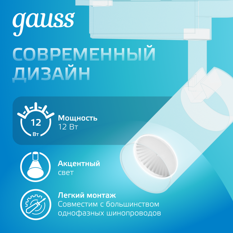 Светильник трековый Gauss цилиндр 12W TR064 это отличный осветительный прибор для создания уютного освещения зон гостинной, спальни, детской, гардеробной, коридора. Может применяться для подсветки витрин магазинов и барных стоек. Компактный дизайн и возможность направить свет в любую точку на стене, витрине или полу в сочетании с легким корпусом дают возможность монтировать светильник как на потолке, так и на любой высоте стены. Спот изготовлен из алюминиевого корпуса, зеркального отражателя и сатинированной линзы. Цвет белый. Встраивается в трековые системы Gauss. Имеет белый нейтральный свет 4000к.
