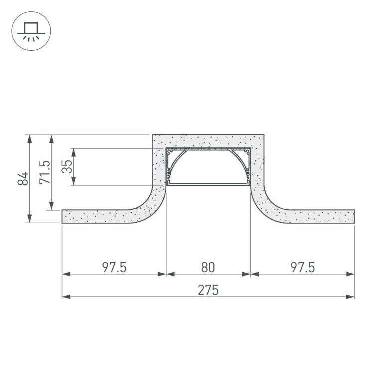 Гипсокартонный модуль серии SLOT со встроенным алюминиевым профилем ALU-POWER-W80N. Внешний вид - прямая линия света в полукруглом слоте (ширина 78 мм). Размеры модуля: длина - 2000 мм, ширина -275 мм, высота - 84 мм. Ширина площадки для ленты - 38,2 мм. Толщина гипсокартона: 12,5 мм. Матовый экран в комплекте. Поставляется не зашпаклеванным. Цена за 1 м. Кратность заказа поставщику: 2 м.