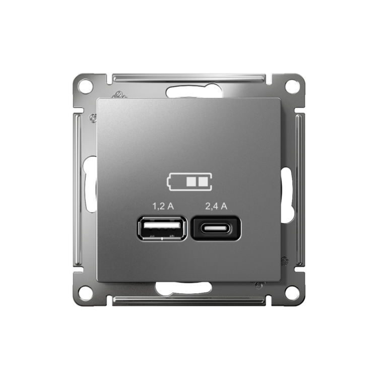Розетка Systeme Electric (ранее Schneider Electric) серии AtlasDesign в цвете сталь двойная USB с разъемами типа A+C. Лицевые детали из качественного ABS-пластика, устойчивого к царапинам и УФ-излучению. Самая современная USB-зарядка с двумя разъемами позволяет заряжать как стандартные мобильные устройства через разъем типа А, так и новейшие устройства, в том числе ноутбуки, с разъемом типа С.