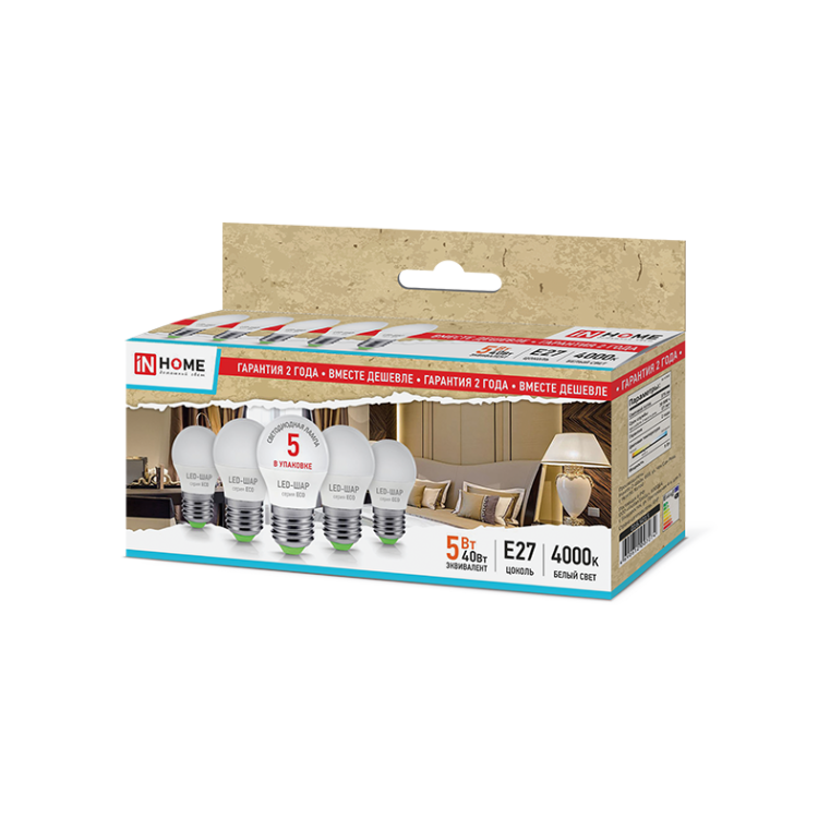 Лампа светодиодная LED-ШАР-ECO 5Вт 230В Е27 4000К 375Лм (5шт в упаковке) IN HOME (кр.20упак)