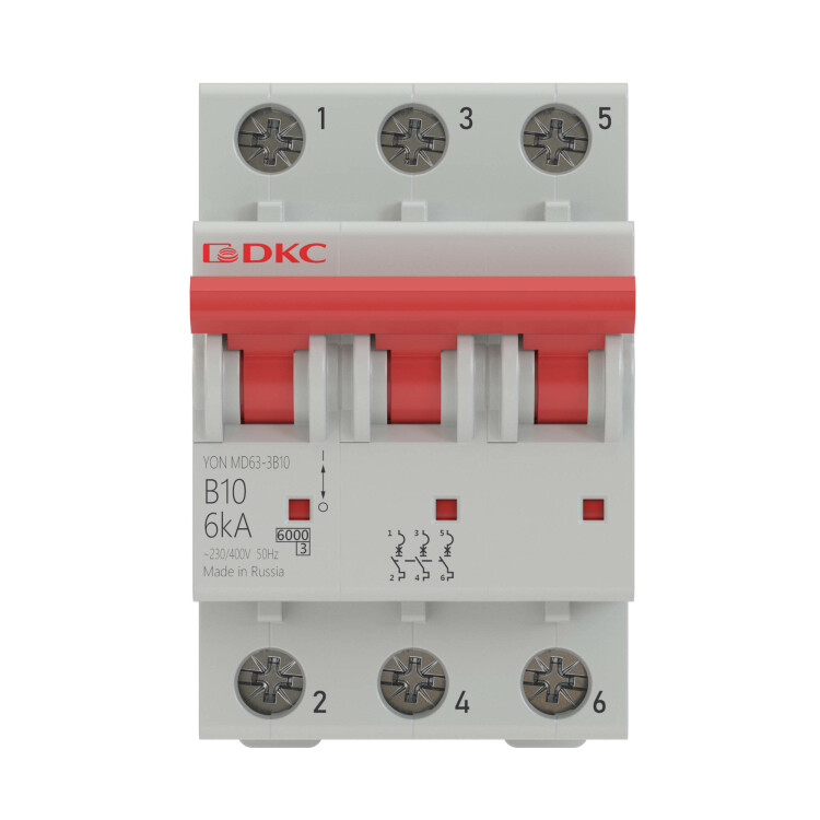 Модульный трехполюсный автоматический выключатель YON MD63 номиналом 63 A с характеристикой расцепителя "C" и отключающей способностью 6 кА предназначен для применения в электрических цепях напряжением до 400 В переменного тока частоты 50 Гц, их защиты при перегрузках и коротких замыканиях, проведения тока в нормальном режиме и оперативного включения и отключения указанных цепей. К выключателю могут присоединяться независимый расцепитель в отдельном модуле и вспомогательные контакты в отдельном модуле. Независимый расцепитель и вспомогательные контакты заказываются отдельно и устанавливаются на выключатели потребителем по мере необходимости.