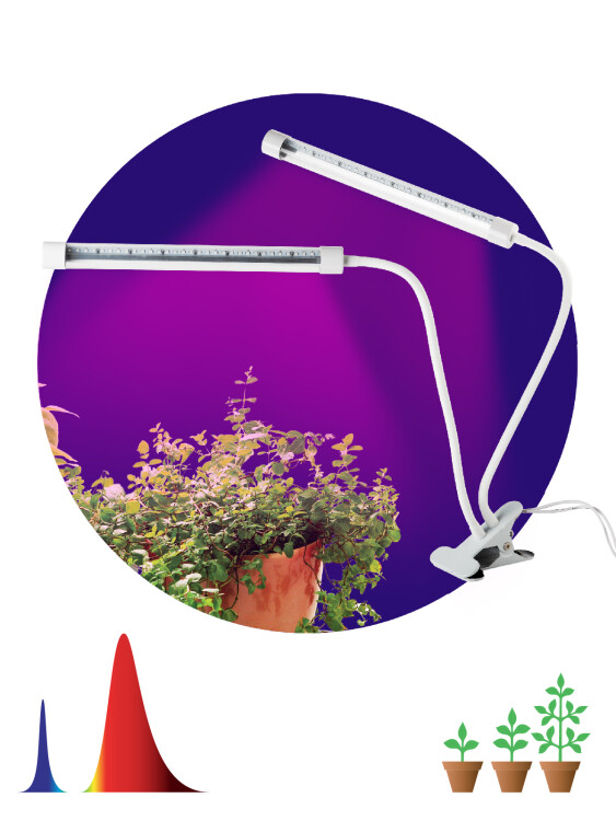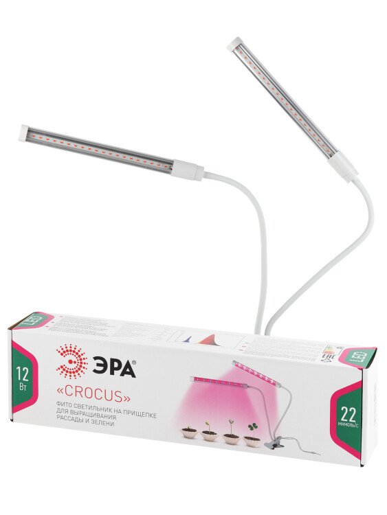 ЭРА FITO-20W-АLED CROCUS эстетичный бытовой фитосветильник на прищепке. Отличное решение для выращивания рассады и зелени на подоконнике. Крепление на прищепке делает светильник удобным в применении, а два удлинённых LED-плафона на гибких стойках равномерно распределяют свет. За счёт прищепки установка конструкции может быть как горизонтальной, так и вертикальной.