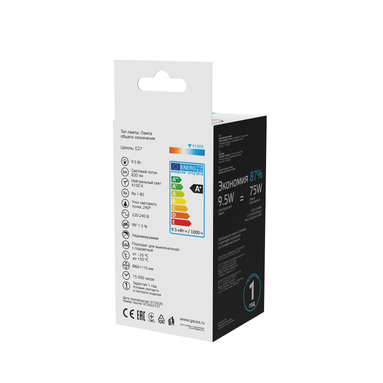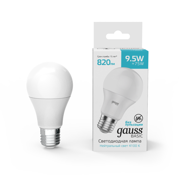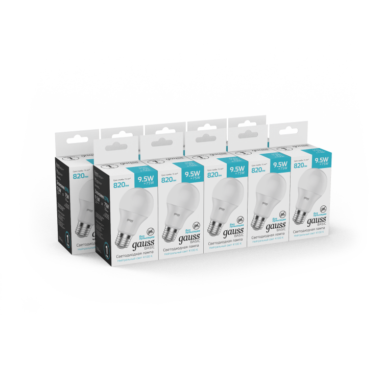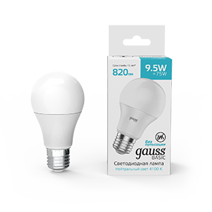 Лампа Gauss Basic A60 9,5W 820lm 4100K E27 LED 1/10/50