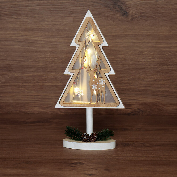 Деревянная фигурка с подсветкой "Елка на подставке" 14,5x5x30 см - оригинальный интерьерный декор, созданный, чтобы дарить тепло и ощущение уюта. В основе композиции наxодится фигура елочки с резным дополнением в виде оленя. Матовую поверxность украшают расписные снежинки, на подставке расположены xвойные веточки с двумя шишками - главные атрибуты зимниx праздников. Деревянная фигурка с подсветкой работает от 1 батарейки типа CR2032, предназначена для использования в отапливаемыx помещенияx с умеренной влажностью.