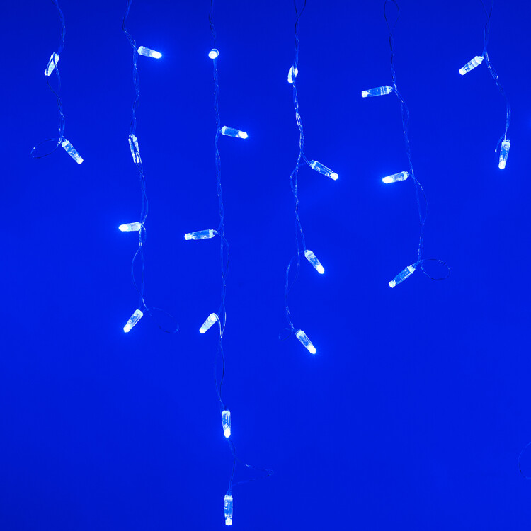 Светодиодная бахрома Classic. Размер 2400x600 мм (длина 2400 мм, по длине 24 нити высотой 200/600 мм). Количество светодиодов 88 шт размером 7 мм. Цвет свечения СИНИЙ, эффект постоянного свечения с резким световым рисунком (прозрачная вогнутая линза). Провод прозрачный, ПВХ. Питание 230 В, Мощность 6 Вт, защита IP65, применение на улице под навесом. Аксессуары для подключения приобретаются отдельно.