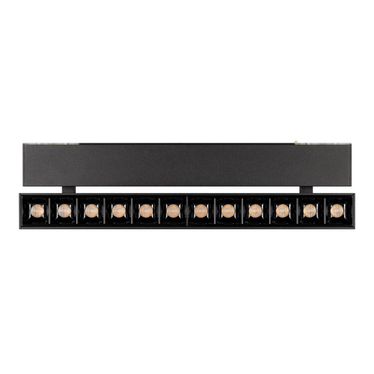 Светильник поворо тный для магнитных треков шириной 45мм, 12Вт. Цвет свечения ТЕПЛЫЙ 3000K, световой поток 800лм, угол 15°, CRI>90. Корпус прямоугольный, металл, цвет черный, IP20. Размеры LxWxH 322x35x92.5мм. Входное напряжение DC24V, мощность 12Вт. Драйвер DС24V/AC230V поставляется отдельно. Диммируется только с 026407(1), 027633.