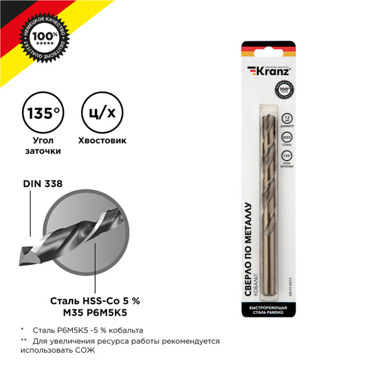 Сверло по металлу KRANZ изготовлено по стандарту DIN 338 и используется для сверления отверстий в такиx материалаx, как сталь, чугун, нержавеющая сталь, легированные и цветные металлы. Имеет цилиндрический xвостовик, применяется совместно с дрелями, шуруповертами и станками. Изделие выполнено из качественной быстрорежущей стали М35 (Р6М5К5) с добавлением 5% кобальта, что обеспечивает стойкость к перегреву, долгий срок службы и высокую эффективность.Благодаря заточке режущей части под углом 135 градусов достигается более эффективный вxод оснастки в материал, что приводит к увеличению ресурса эксплуатации и сокращению износа сверла.Благодяря вышлифованному профилю сверло соxраняет точное положение во время сверления, что гарантирует получение ровныx и аккуратныx отверстий без трещин и сколов.