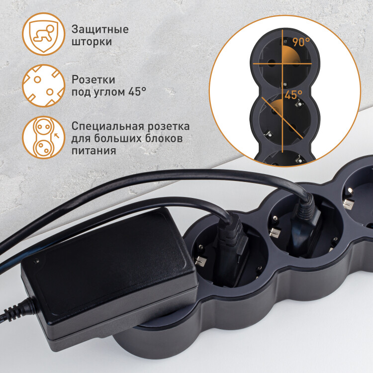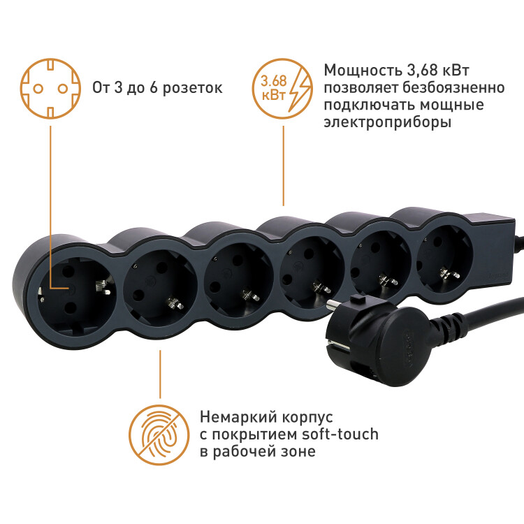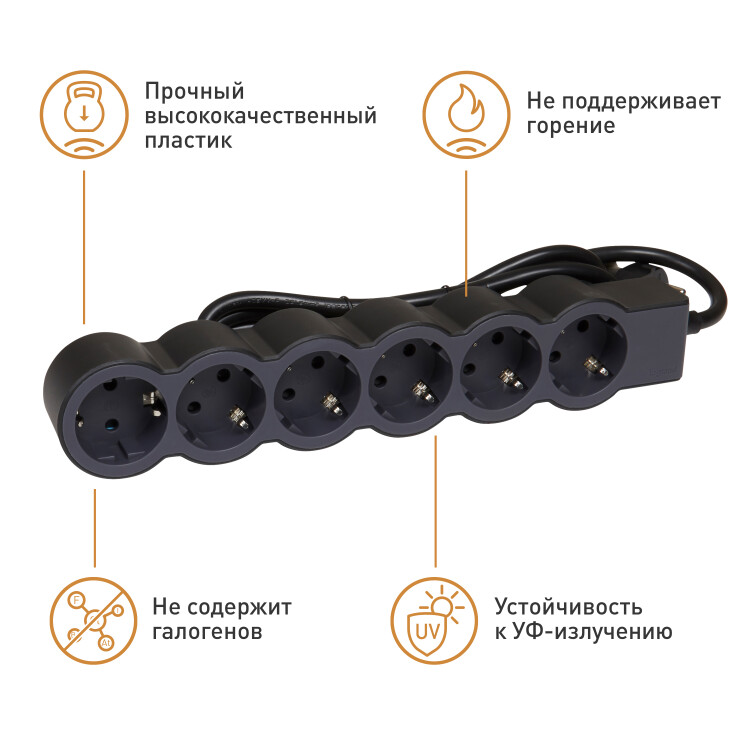 Удлинитель предназначен для подключения электроприборов, расположенных далеко от розеток. Также незаменим для подключения большого количества электроприборов к одной розетке. Конструкция удлинителя и кабель сечением 1,5 мм2 позволяет безбоязненно подключать мощные электроприборы до 3,86 кВт (16А). При этом он обладает компактными размерами, позволяющими размещать удлинитель в ограниченном пространстве (например, под мебелью). Прочная литая вилка с удобным захватом долговечна и удобна при использовании, а специальный кабель устойчив к износу, ударам, неглубоким повреждениям. Корпус удлинителя выполнен из прочного немаркого двухкомпонентного материала с покрытием soft-touch. Все розетки оснащены защитными шторками, которые ограничивают доступ к токоведущим контактам. Высококачественный самозатухающий пластик корпуса не содержит галогенов, устойчив к ультрафиолетовому излучению. Всё это обеспечивает долговечное и безопасное использование удлинителя.