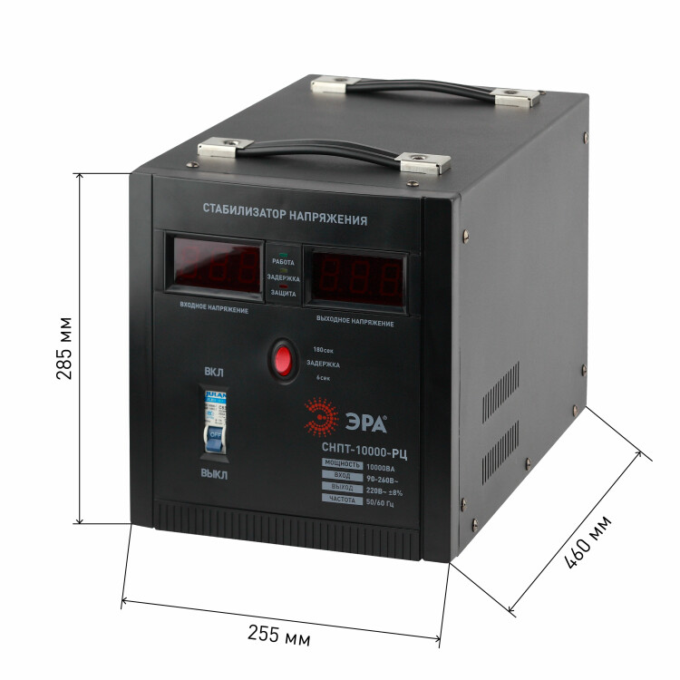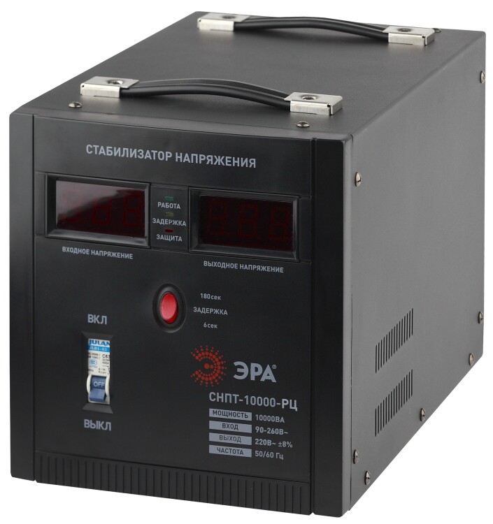 Стабилизатор напряжения переносной / напольный однофазный релейный цвет чёрный модели СНПТ-10000-РЦ. Номинальные характеристики (полная мощность / диапазон входного напряжения): 10000ВА. Предназначен для поддержания стабильного однофазного напряжения питания бытовых приборов при отклонениях значений сетевого напряжения. Выбирая стабилизатор, нужно знать, какое электрооборудование будет к нему подключено: один прибор, группу приборов (наиболее чувствительных к перепадам напряжения в сети) либо вся домашняя (офисная) техника. Затем необходимо рассчитать суммарную мощность защищаемых электропотребителей. Основное условие выбора мощности стабилизатора напряжения - суммарная мощность подключаемой к нему нагрузки не должна превышать полной мощности самого стабилизатора (в противном случае автоматика стабилизатора будет их просто отключать). Точные значения мощности можно узнать из паспортных данных Вашего конкретного потребителя. Стабилизатор подбирается с запасом в 25-30% к его полной мощности.