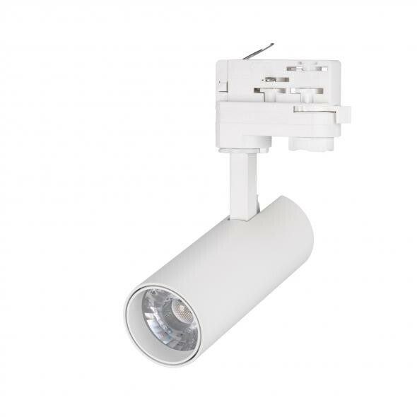 Светильник подвесной для треков/шин 4 провода. Мощность 10 Вт, св. поток 860-1060 лм, 90 лм/Вт, белый 6000 K, CRI>90, угол 24°, напряжение питания 230 В. Белый круглый корпус из алюминия, материал линзы PMMA , степень защиты IP20. Размер: диаметр 55 мм, высота 145 мм. Монтаж на трек 3-фазный. Драйвер встроенный 27-38 В, 260 мА., пульсация