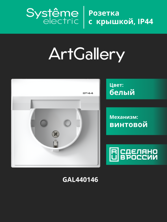 Механизм Systeme Electric серии ArtGallery Aqua в цвете белый розетки одинарной с заземлением, шторками и крышкой подходит для сетей 250 В, на ток 16 А.