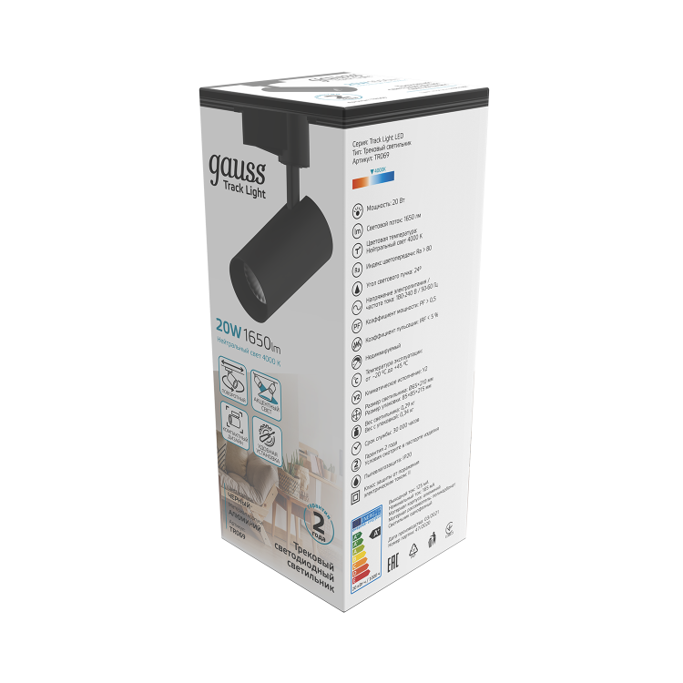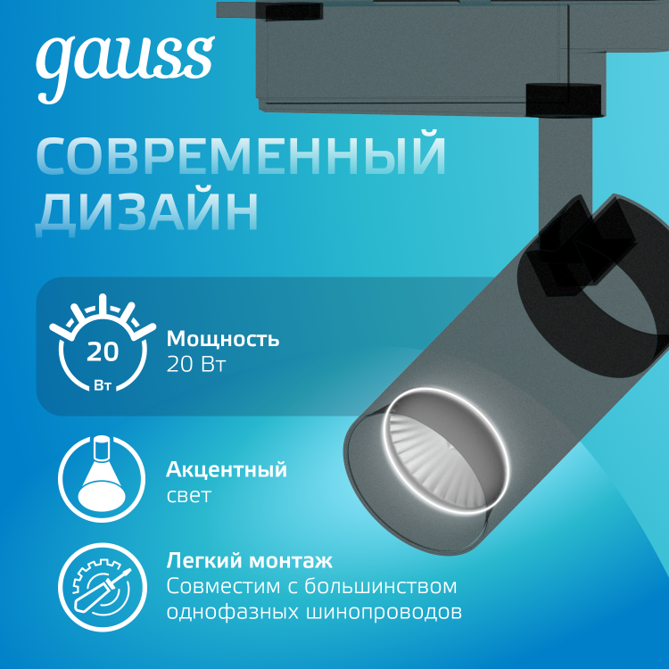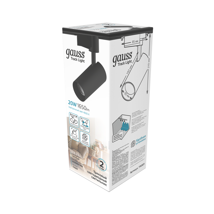 Светильник трековый Gauss цилиндр 20W TR069 состоит из алюминиевого корпуса с зеркальным рефлектором внутри и сатинированным рассеивателем. У него мощный световой поток 1650лм при угле рассеивания 24°. Светильник предназначен для акцентного освещения в разных зонах жилых, офисных и коммерческих помещений с сухим не запыленным воздухом. Может быть использован как соло, так и в комплексе с другими трек-спотами Gauss. Свет корпуса черный, цветовая температура 4000К (нейтральный белый свет).