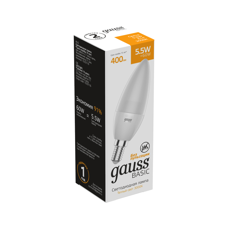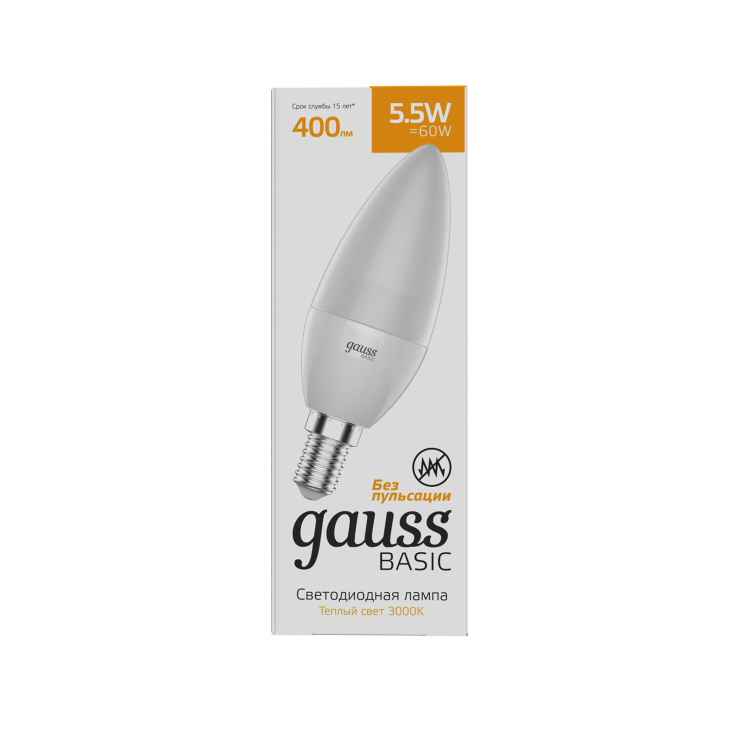 Лампа Gauss Basic Свеча 5,5W 400lm 3000K E14 LED 1/10/100